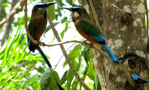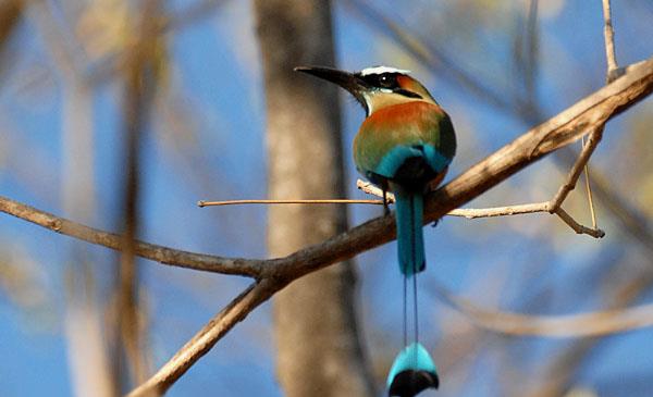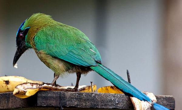 薩爾瓦多及尼加拉瓜國鳥,中小型攀禽。體羽為輝亮的綠、藍及褐色。眼睛上有一道鮮藍色紋,喉嚨上有一黑斑。尾長,中央尾羽特長,在近末端處有一段僅余羽干,致使端部形成獨立的小羽片,形成球拍狀,為其顯著特征。