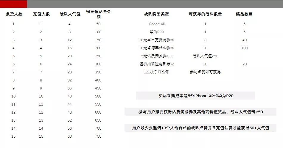 我按照我對(duì)規(guī)則的理解對(duì)參與后的行動(dòng)做了推算,下圖是按照最快達(dá)成速度推算的,活動(dòng)規(guī)則中要想獲得比較不錯(cuò)的獎(jiǎng)品,必要條件是戰(zhàn)隊(duì)獲得50人氣值,獲得人氣值最快的辦法就是邀請(qǐng)手機(jī)好友既給自己點(diǎn)贊、又通過(guò)戰(zhàn)隊(duì)的名義充話費(fèi)。