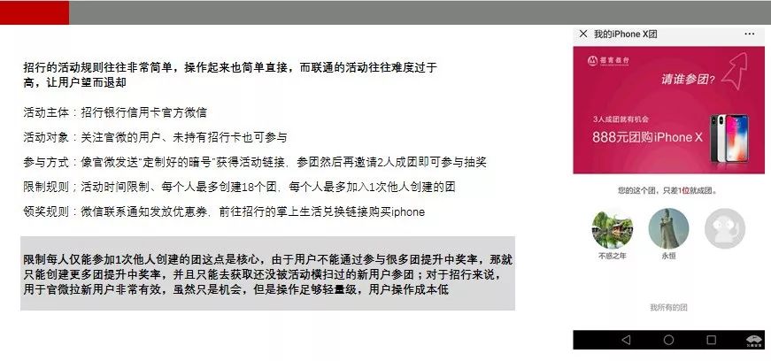 我重新搜索了2017年及2018年的招行3人成團(tuán)抽iphone的活動(dòng),對(duì)比后發(fā)現(xiàn)活動(dòng)規(guī)則幾乎完全一致,其中的差異僅僅是滿減度、獎(jiǎng)品份額、開(kāi)團(tuán)限額,其中最一致的是“每個(gè)用戶只能參加1次他人開(kāi)的團(tuán)”,這也是招行活動(dòng)的核心促進(jìn)點(diǎn),限制參團(tuán)次數(shù)是為了刺激用戶開(kāi)團(tuán),激勵(lì)用戶開(kāi)團(tuán)后幫助招行拉新用戶參加活動(dòng),參加活動(dòng)就關(guān)注了官微。