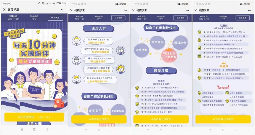 主界面有固定版塊:開課時間、剩余名額、聯(lián)系客服、報名及倒計時四個明顯標(biāo)識。第一時告知時間,其次名額和倒計時增加報名緊迫感。而聯(lián)系客服使得一旦頁面故障或有其他問題時,為用戶流失增加一道關(guān)卡。