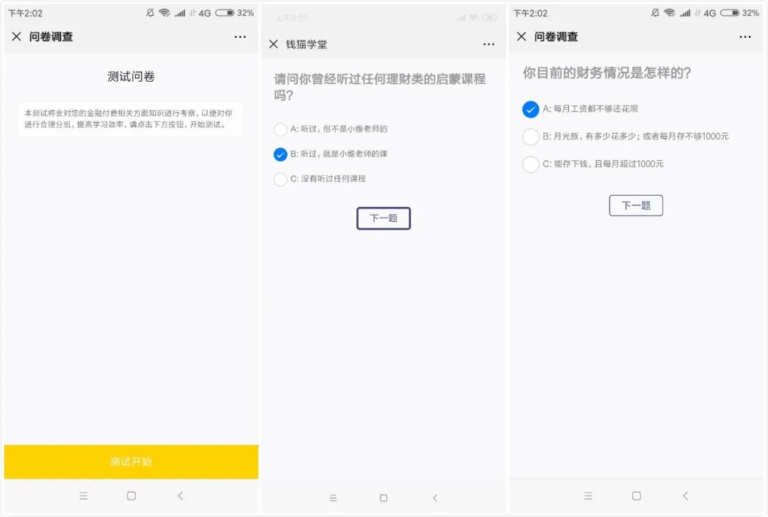 比如問題“你現(xiàn)在的資金狀態(tài)是?”可多選的選項里還有“中年危機”、“我來交好朋友的”這類答案,明顯答不對題,不知道是問卷問題還是設(shè)計不嚴(yán)謹(jǐn)。問卷本意是可以收集學(xué)員信息,是有助于后續(xù)的學(xué)員維護和轉(zhuǎn)化的,所以這里可以在問卷邏輯和內(nèi)容設(shè)計上再有優(yōu)化。