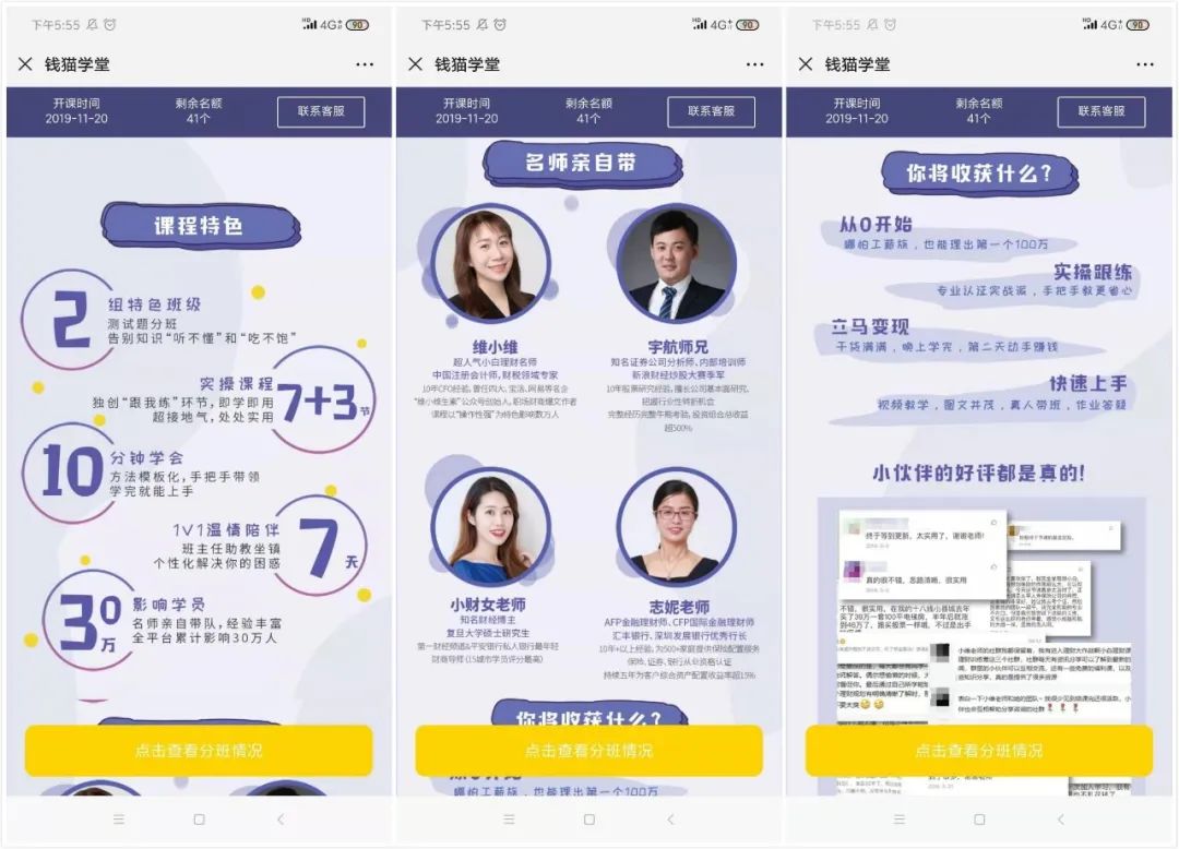 類比同類如長投的課程,報名付款之后就直接可以看到帶解鎖的課程,即付款后就得到產(chǎn)品。而錢貓目前是通過報名后添加學(xué)委,開營時再添加班主任開通課程(視頻課程依托于小鵝通平臺)。而課程詳情頁面最下方的引導(dǎo)寫的“購買后如何聽課,是關(guān)注公眾號可看到課程”,但報名后其實不能第一時間看到課程,這里容易引起歧義。