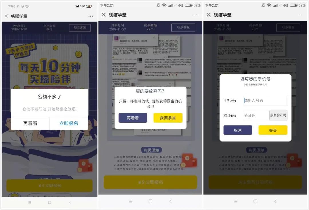 提醒需要填寫手機才能分班,也是一個獲取用戶情況的環(huán)節(jié)。如果后續(xù)需要召回用戶之類的,也可以派上用場。