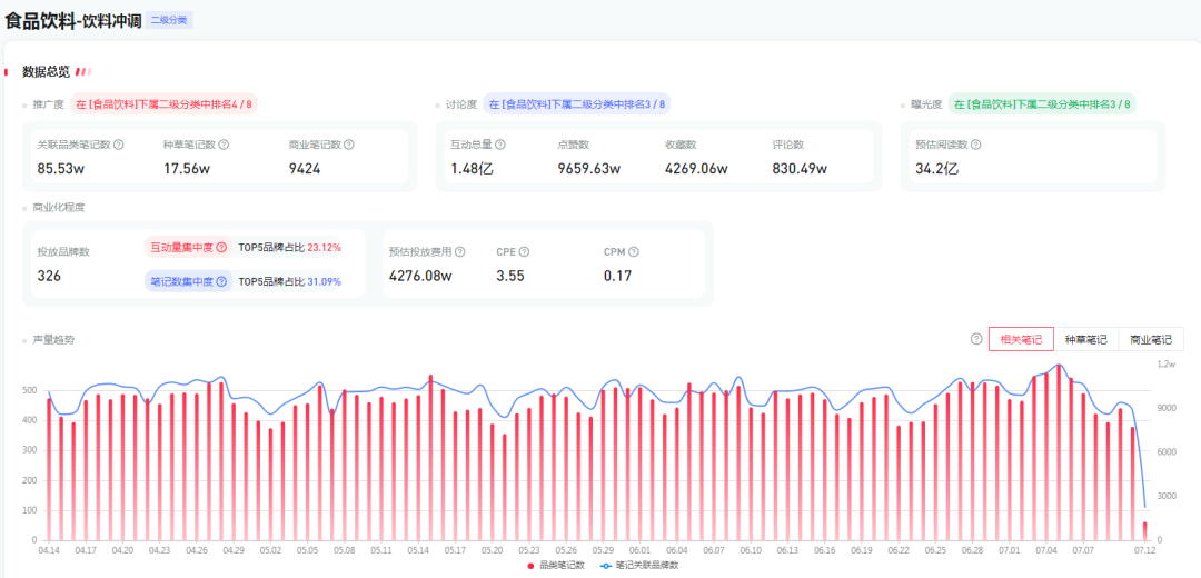 如圖所示,近3個(gè)月以來,飲品類的預(yù)估閱讀量達(dá)到了34.2億,你沒有看錯(cuò),是3個(gè)月曝光34.2億。在這個(gè)不容忽視的數(shù)據(jù)背后,足以見證飲料行業(yè)在近期的火爆程度。伴隨著消費(fèi)者對(duì)個(gè)性化、健康保健的迫切追求,各大品牌紛紛加大在營銷和創(chuàng)新上的投入,試圖在這個(gè)市場(chǎng)競(jìng)爭(zhēng)中搶占先機(jī)。