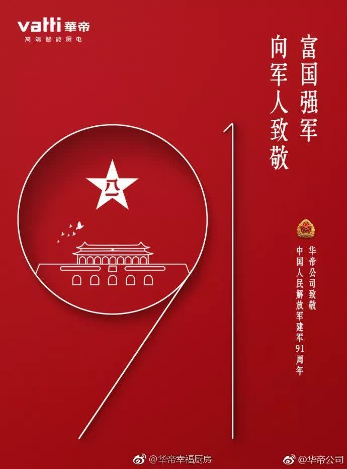 “#八一建軍節(jié)#無論我們身在何方,身后總會有他們,致敬最可愛的人!”,華帝用91、八一、天安門等元素表現(xiàn)致敬中國人民解放軍建軍91周年。