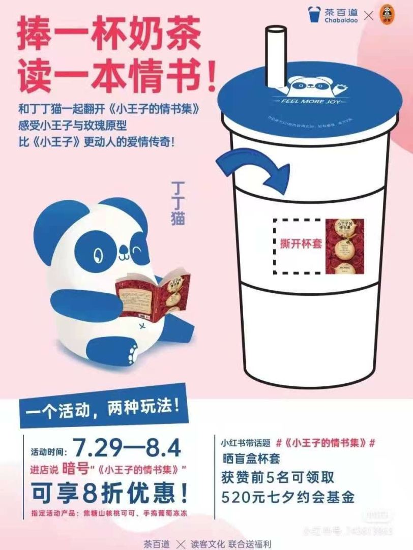 描繪小王子與玫瑰原型的《小王子情書集》是動人的愛情傳奇,茶百道與熊貓君攜手,在8月4日當(dāng)天上海地區(qū)購買飲品可獲聯(lián)名杯套并且撕開杯套參與《小王子情書集》的抽獎。