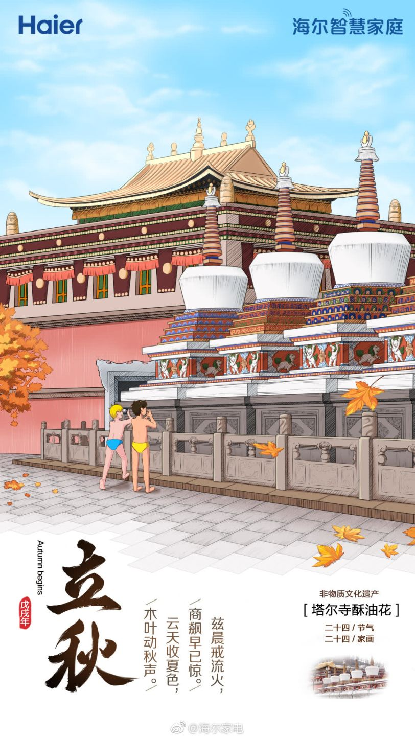 此外,海爾家電與塔爾寺攜手推出海報(bào),宣傳非物質(zhì)文化遺產(chǎn)“塔爾寺酥油花”,從傳統(tǒng)文化出發(fā),為塔爾寺宣傳的同時也增大了自身的影響力,實(shí)現(xiàn)雙贏。