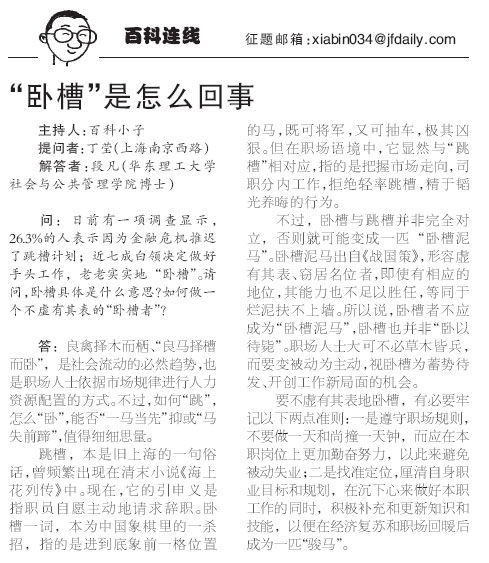 問:日前有一項調(diào)查顯示,26.3%的人表示因為金融危機推遲了跳槽計劃;近七成白領(lǐng)決定做好手頭工作,老老實實地“臥槽”。請問,臥槽具體是什么意思?如何做一個不虛有其表的“臥槽者”?