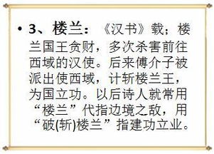 《漢書》載;樓蘭國王貪財(cái),多次殺害前往西域的漢使。后來傅介子被派出使西域,計(jì)斬樓蘭王,為國立功。以后詩人就常用“樓蘭”代指邊境之?dāng)?,用“破(斬)樓蘭指建功立業(yè)。