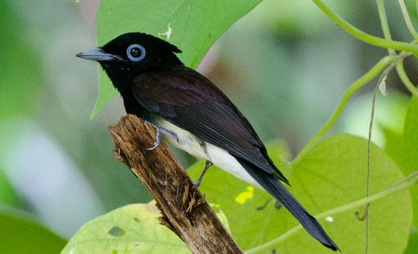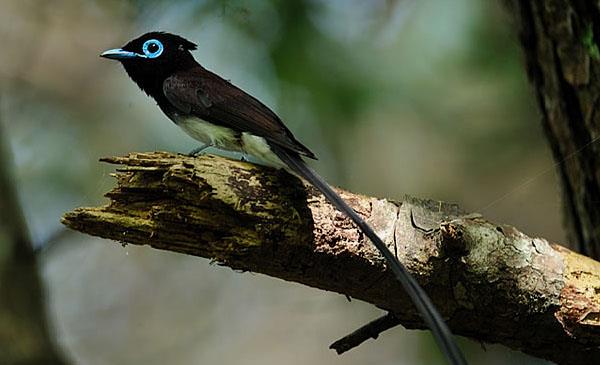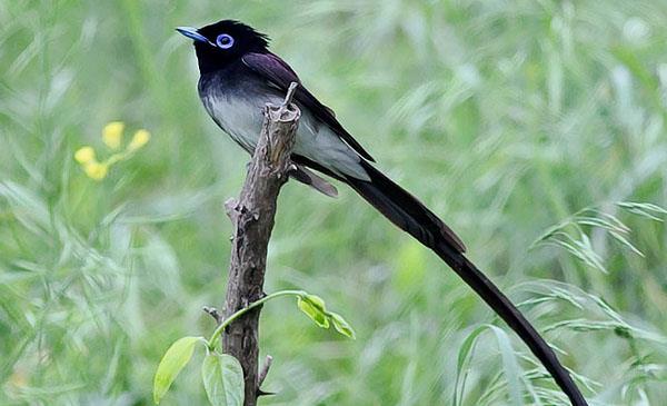 頭體長19-21cm,雄鳥計尾長40cm左右,重19-25g。喙基較寬闊,嘴強健,上喙先端稍下彎并具銳鉤,有較發(fā)達的口須。翅尖,尾叉形。腿、腳強健,爪鉤狀。成年雄鳥胸部的羽毛呈黑灰色,有紫藍色的光澤,具冠羽。下身則是白色。翼、背部及臀部呈黑栗色。尾巴中央有極長的黑色尾羽,雄雛鳥的此尾羽則較短。虹膜深褐,眼周裸露皮膚藍色,嘴藍色,腳偏藍??砂l(fā)出笛聲及甚響亮的chee-tew聯(lián)絡叫聲,似黑枕王鹟叫聲,但較強烈。