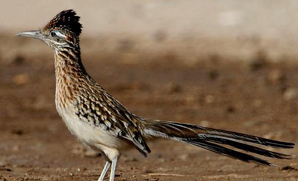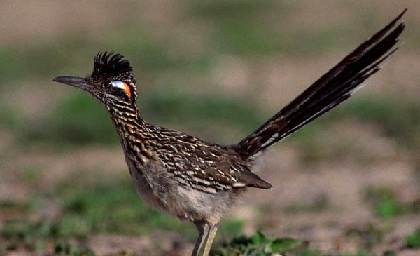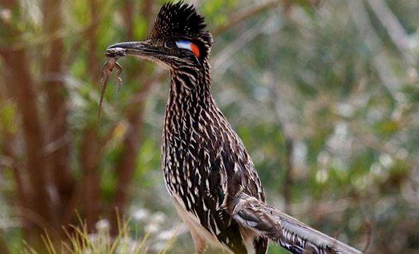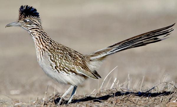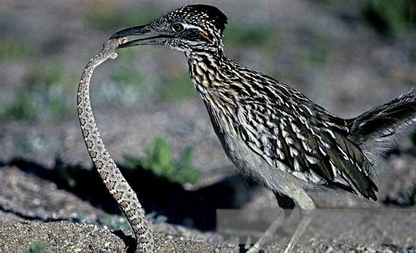 加州走鵑:別名灌叢雞_跑路鳥,為鵑形目、杜鵑科、走鵑屬鳥類,原產(chǎn)于北美洲至中美洲,包括美國、加拿大、墨西哥、格陵蘭、百慕大群島等地。喜歡沿著道路快速跑或穿行于荒原、灌木叢,捕食昆蟲、蜥蜴和蛇。1829年命名。捕到爬蟲類后,用結(jié)實(shí)的喙將其啄死,然后從頭部開始吞下。一旦與響尾蛇相遇,就會(huì)爆發(fā)一場生死搏斗,它跳躍著躲開響尾蛇的攻擊,并尋找機(jī)會(huì)撲到蛇的嘴后,用喙和腳爪猛擊蛇頭,如果它勝利,它將得到一頓美餐。但如果失敗,代價(jià)就是死亡,但它從不退縮。